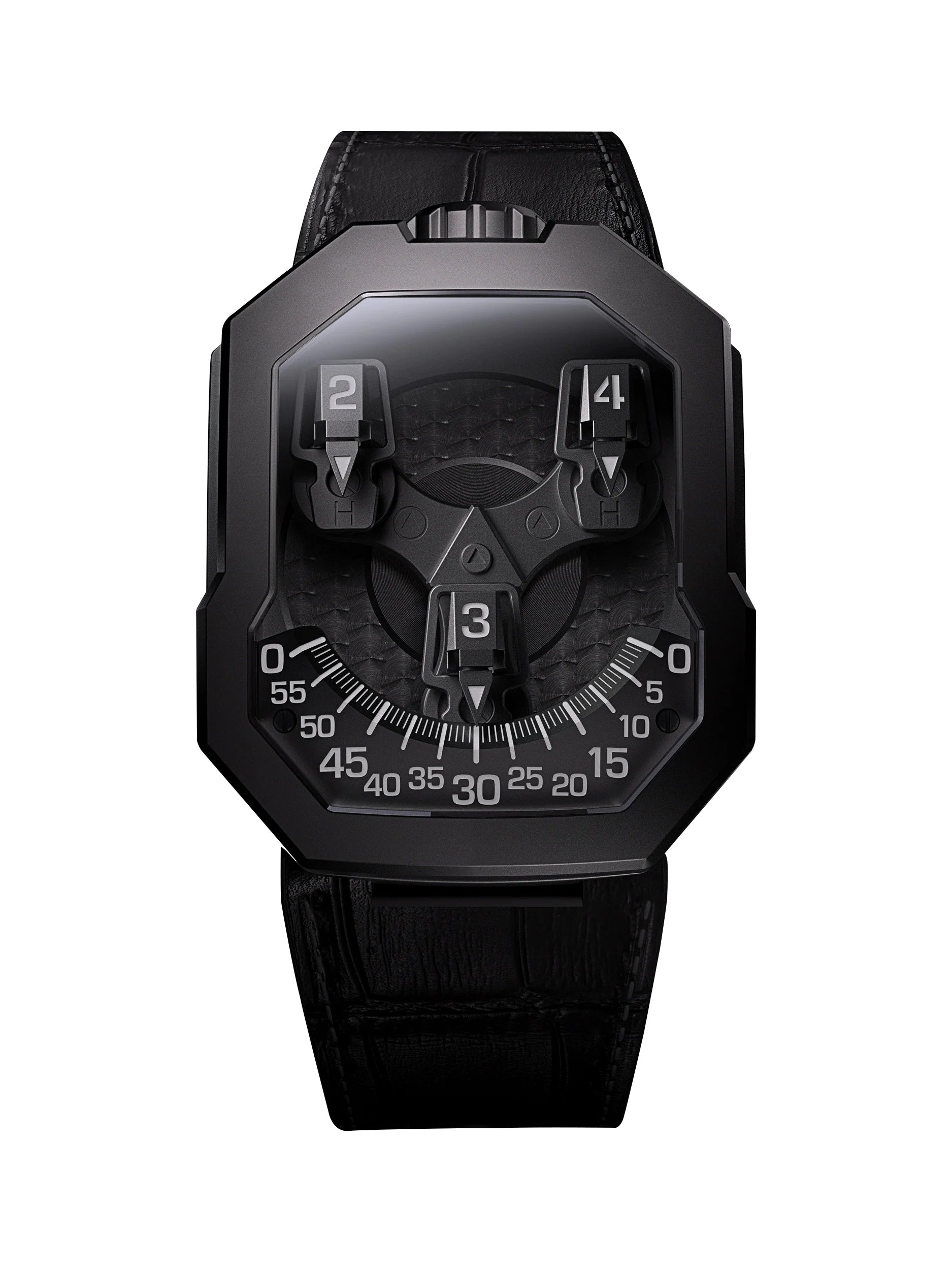 - Grade 5 titanium arm, anodized aluminum Rotating proprietary pyramids, and Fish Scale Pattern dial,Swiss Super-Luminova™ coated numerals on the semi-circular minute track, and Rotating pyramids.